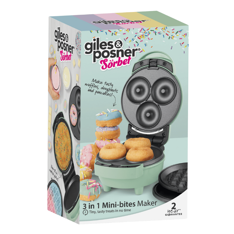 Treat friends and family to an array of sweet treats with this fantastic 3-in-1 Mini-Bites Maker. Whip up bite-sized doughnuts, waffles, or pancakes in minutes with the easy-to-use non-stick plates. The 3-minute preheat cycle and intuitive power/ready lights get you started in no time. With sturdy non-slip feet and a compact design, this maker is perfect for any kitchen. Cleaning is a breeze with the smooth, non-stick surfaces. Perfect for a fun family breakfast or a quick snack, this Mini-Bites Maker is sure to delight. The detachable plates make it easy to store and clean, making it a great addition to any home.