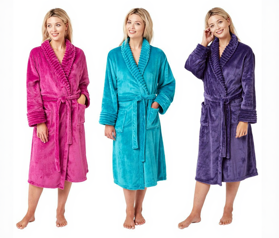 Ladies Ripple Trim Fleece Robe With Pockets by Indigo Sky
