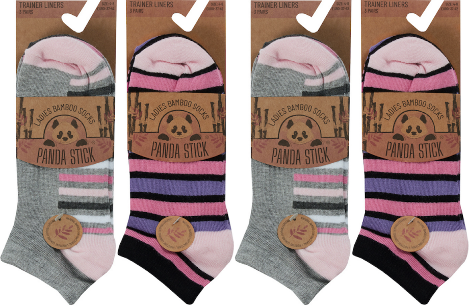 Experience luxurious comfort with these Ladies bamboo blend trainer liner socks by Panda Stick, available in a convenient 3 pair pack. Made from a blend of pure natural bamboo fibres, they are exceptionally breathable, moisture-wicking, and naturally antibacterial, providing optimal performance for sports and casual wear.