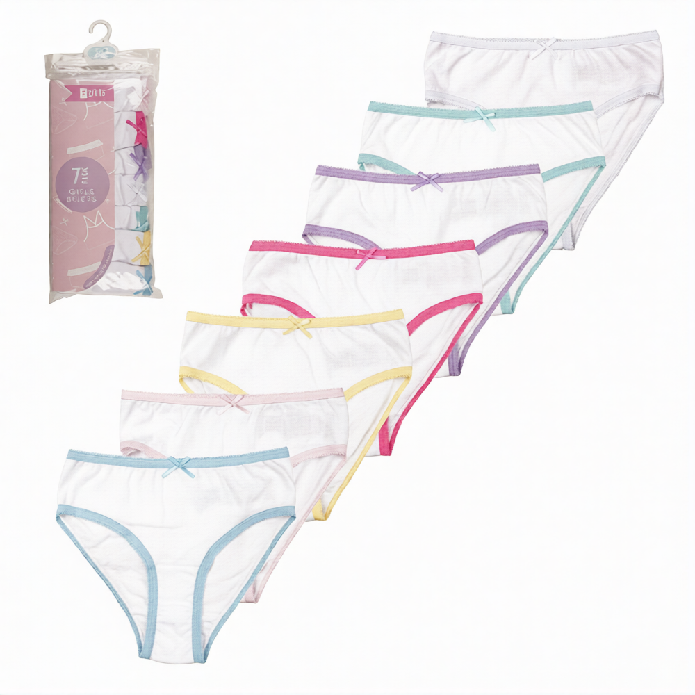 Girls 7pk 100% Cotton White With Coloured Trim Briefs by Tom Franks Girls 12 x 7 Pair Pack