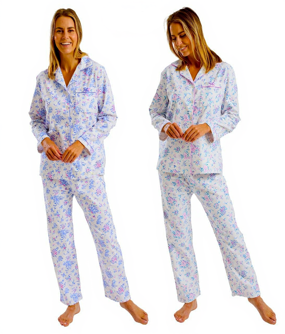 Ladies Brushed 100% Cotton Floral Bouquet Print Wincyette Revere Collar Pyjamas