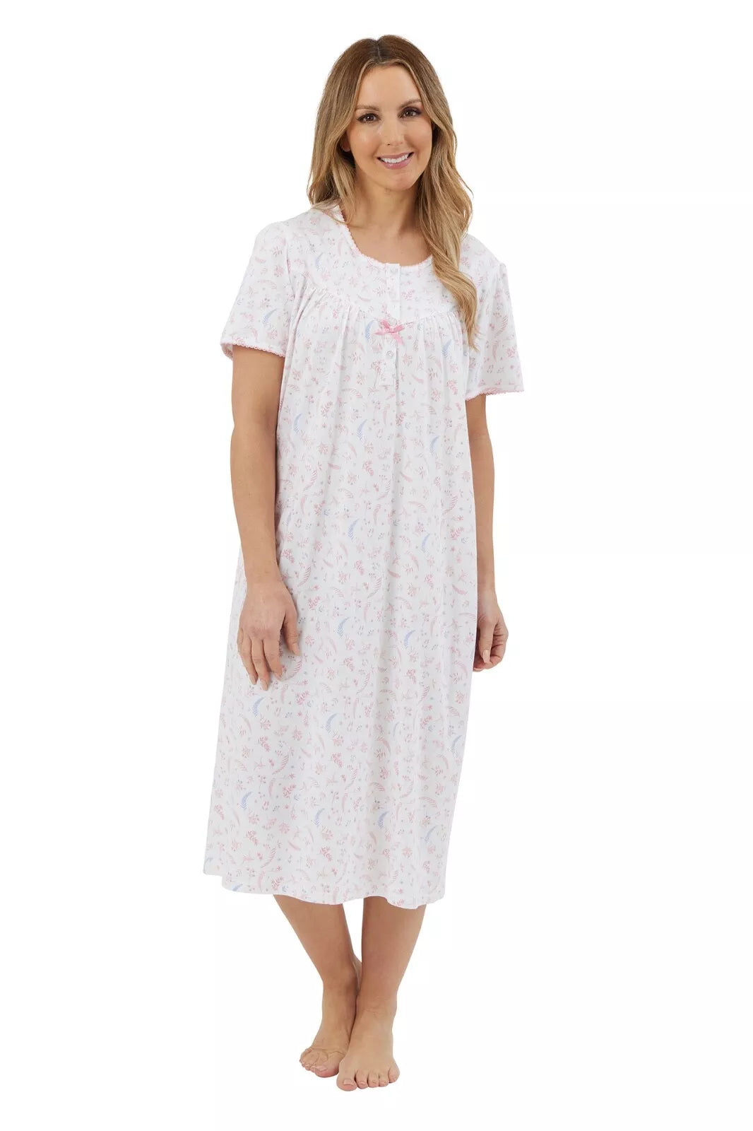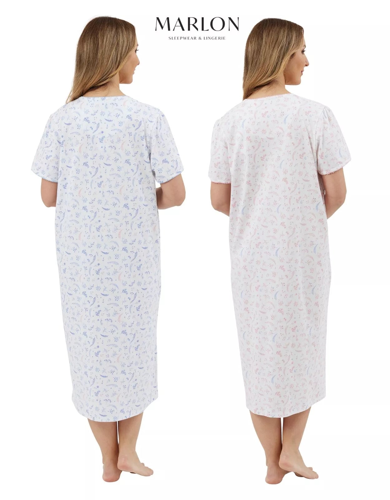 Discover comfort and style with our Marlon Ladies nightdress. Crafted with premium 100% jersey cotton, it features a charming Harvest Floral pattern and a flattering gathered yoke. The short sleeves and practical button-up front ensure a comfortable fit for any height. This nightdress is perfect for the upcoming season.