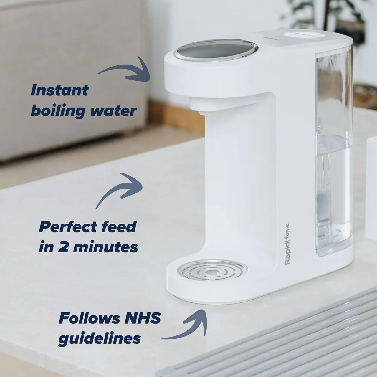 Introducing the Nuby Rapidhot Formula Preparation Machine, the ultimate solution for quick and hassle-free bottle preparation. With instant, filtered boiling water and adjustable feed sizes, you can have the perfect feed in just 2 minutes. Say goodbye to waiting and hello to a happy, fed baby. Perfect for late night feeds with its memory function.