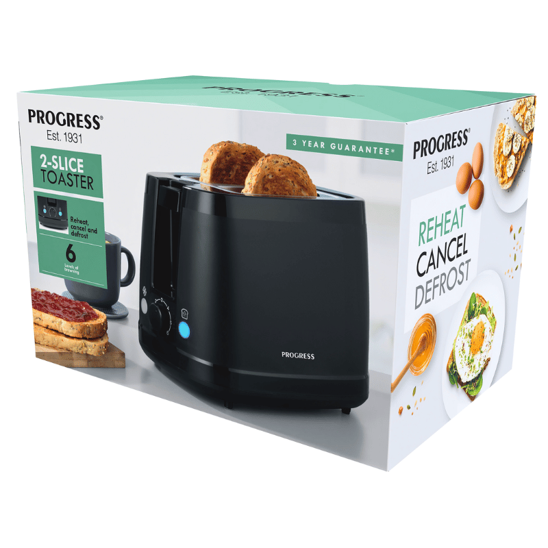 Bring café-quality toast to your countertop with the Progress 2-Slice Toaster in sleek black. Two versatile slots accommodate bread, bagels, crumpets and more. Quickly reheat leftovers, defrost frozen slices or cancel mid-cycle with dedicated controls. The stylish black finish complements any kitchen décor, making it a perfect addition to your home. With six browning settings, you can choose the exact shade you crave, from lightly warmed to deeply caramelized.