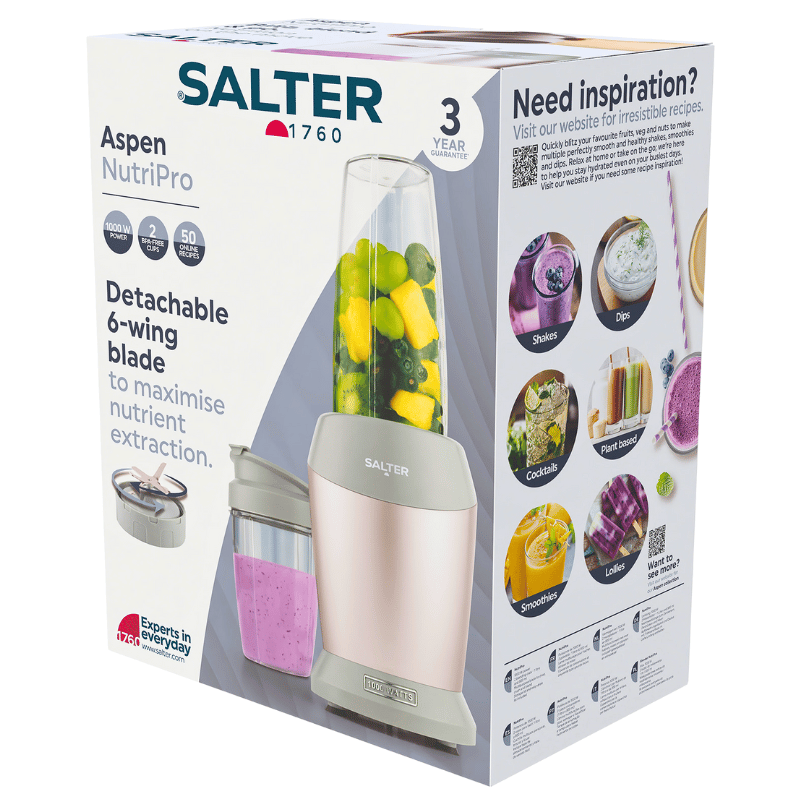 Blend your way to a healthier lifestyle with the Salter NutriPro Personal Blender, featuring a 1L jug and 800ml travel cup. Its robust 1000W motor and 6-wing stainless-steel blade ensure silky-smooth results every time. One-touch operation makes it effortless to whip up shakes or cocktails, while the compact design complements the Salter Aspen Collection. The BPA-free travel cup with spill-proof lid keeps your drink secure on-the-go. With its powerful performance and convenient design, this blender is perfect for kickstarting your healthy routine or serving up delicious cocktails for guests.