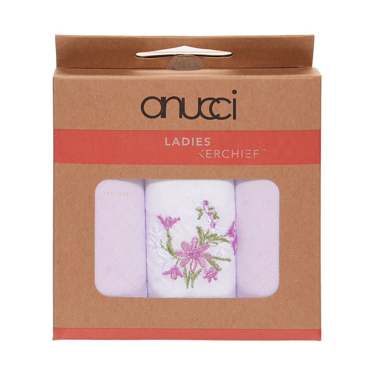 Ladies 3pk Embroidered Polycotton Handkerchiefs In Brown Display Box by Anucci 12 x Packs of 3