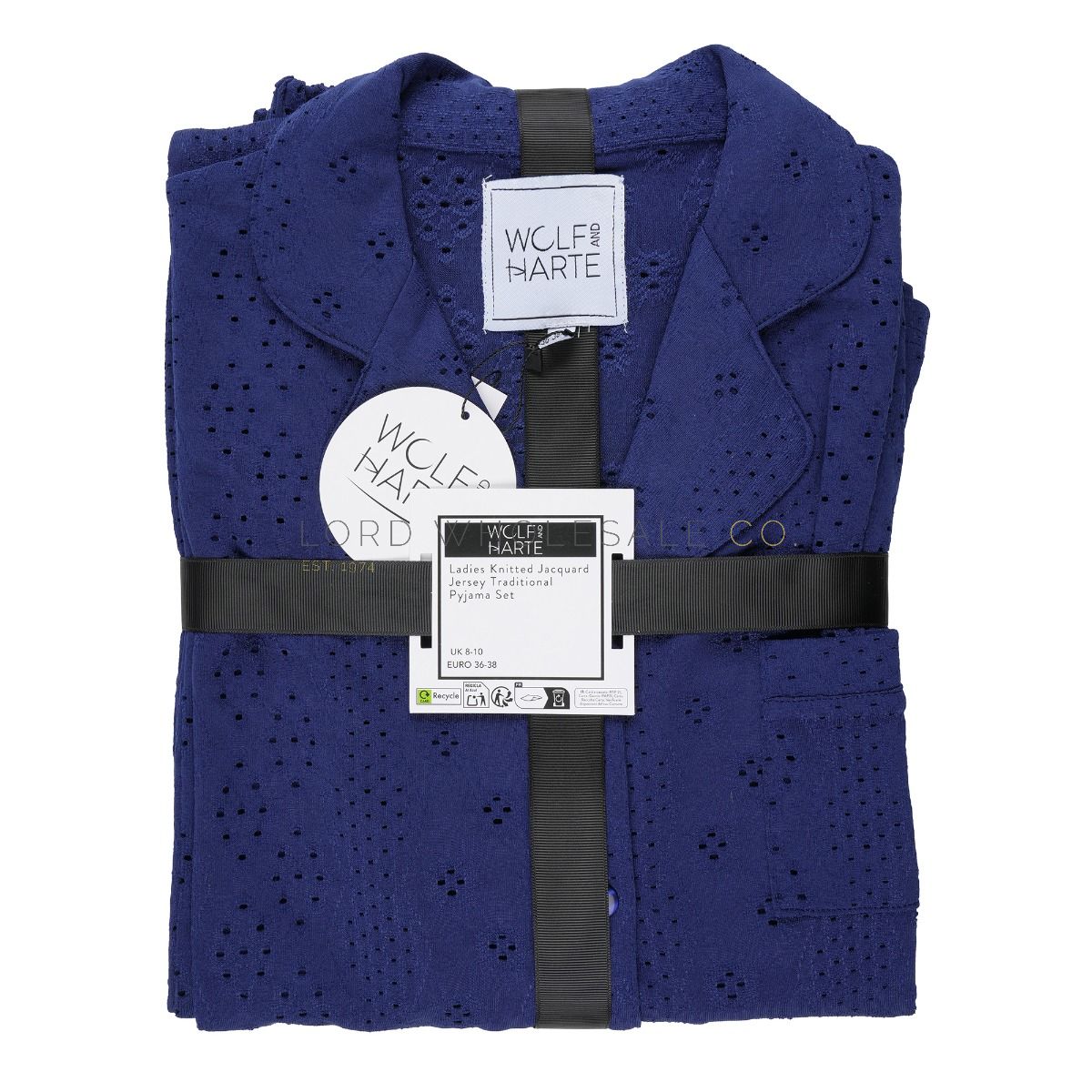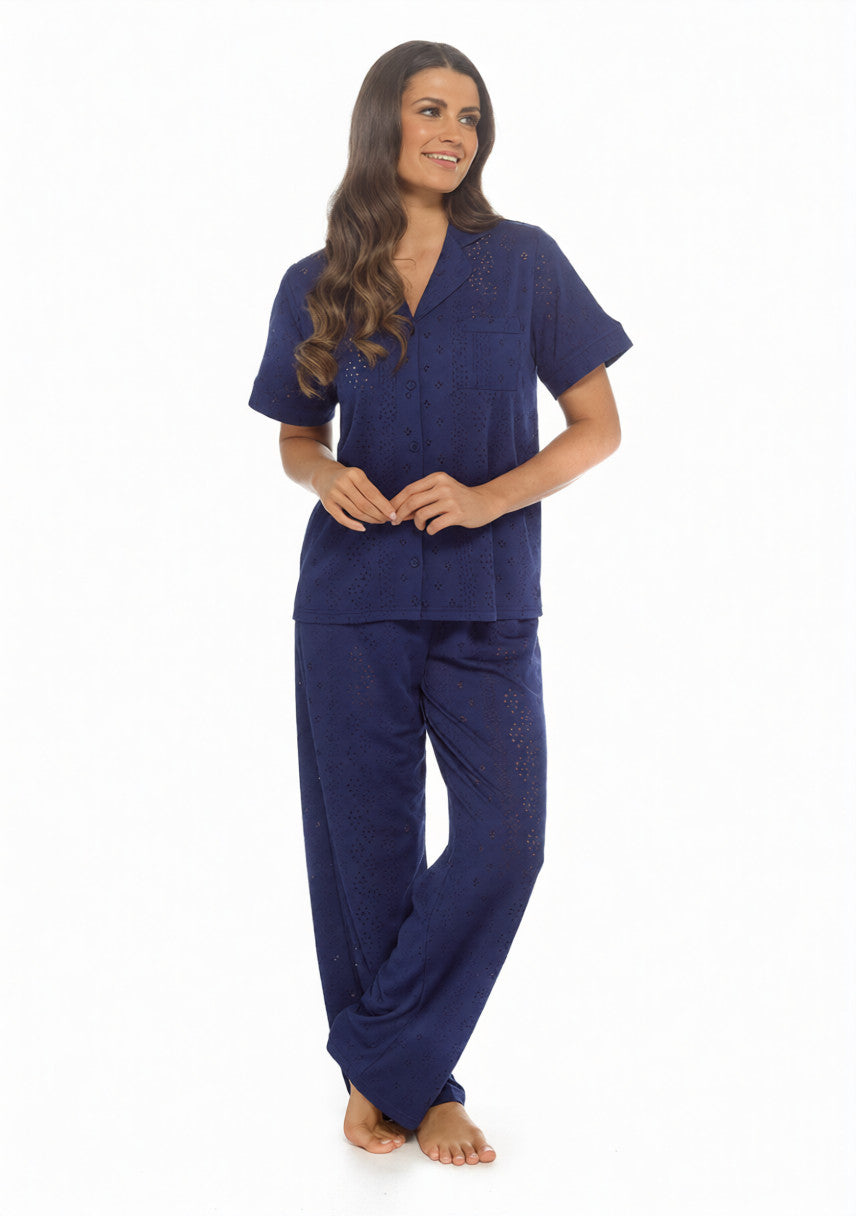 Ladies Navy Knitted Jaquard Traditional Button Short Sleeve Pyjama Set by Wolf & Harte 6 Pieces