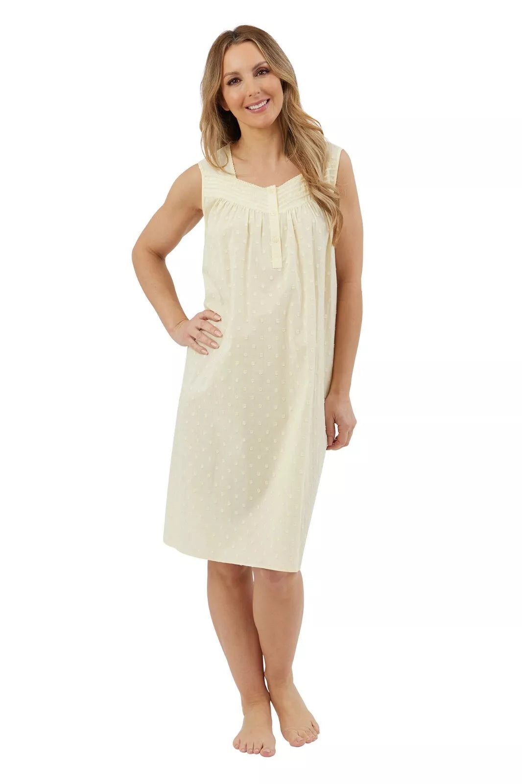 Indulge in comfort and style with our Ladies 100% Cotton Spot Sleeveless Nightdress. The pintucked neckline and gentle gathers create a flattering silhouette, while the self-fabric binding and 40" length ensure ultimate comfort. Made with luxurious 100% cotton, it comes in 3 pastel colours and a raised spot texture.